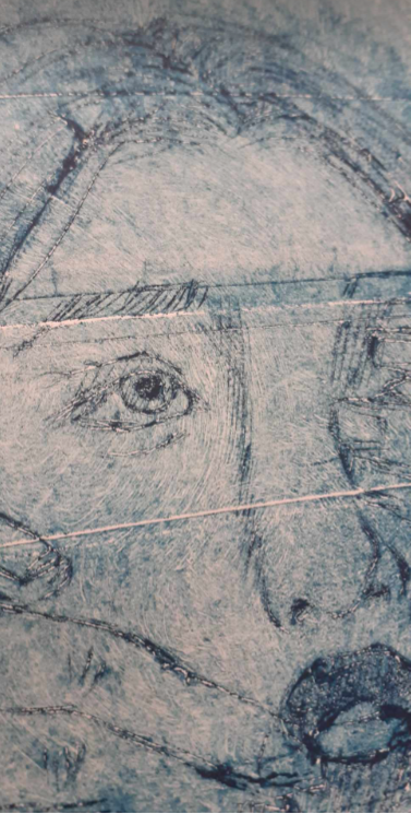 I also really enjoyed the process itself and working with the inks. The unique parts of the process include soaking the paper to print on before printing on it and also scraping the ink into all the lines and crevice's before scrubbing away at it. it was challenging but fun to play around with plate tone by scrubbing away more or less ink revealing brighter and darker parts after printing, as seen below in my first print i tried to make the middle and face area brighter and the surrounding area I left more ink and I feel like having more contrast like this creates more of a visually appealing look as well as a more in depth feel to the piece.